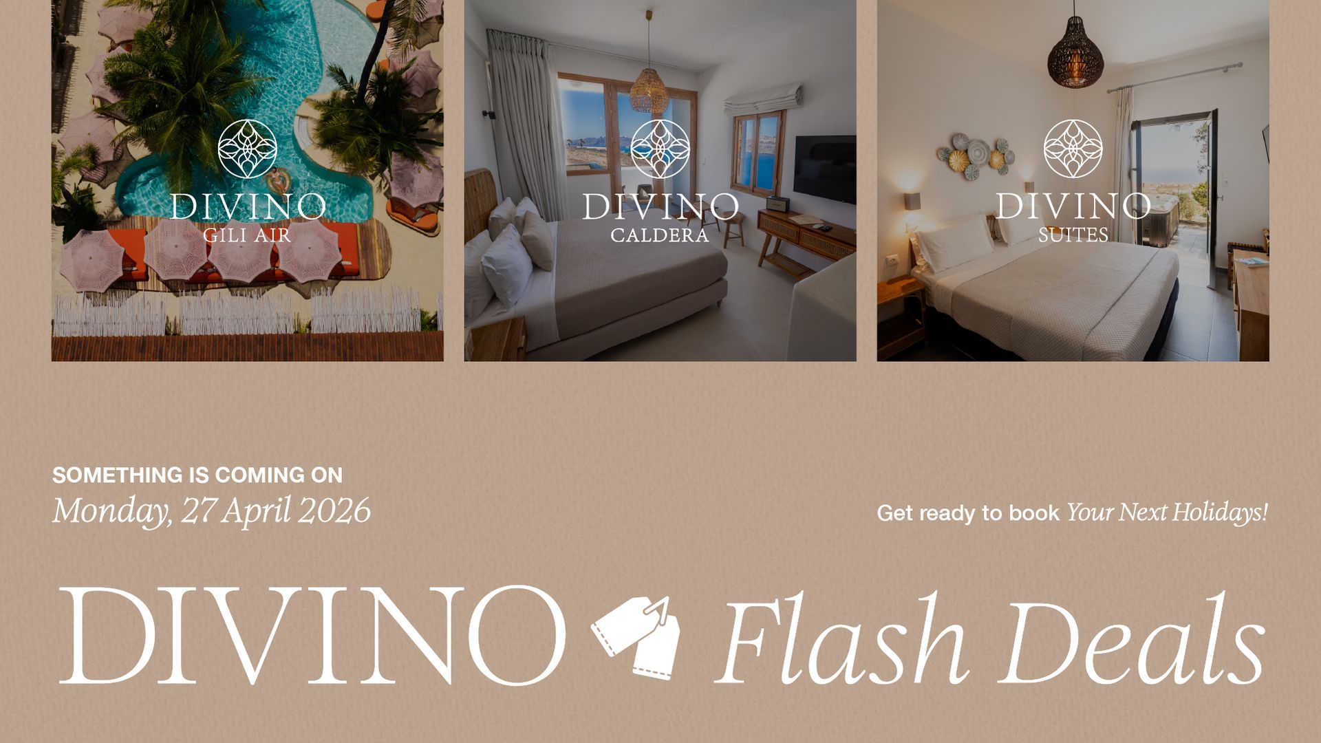 On April 27, 2026, Divino Resorts is releasing something exclusive — a limited-time offer across all three of our boutique properties that you won't find on any other booking platform.